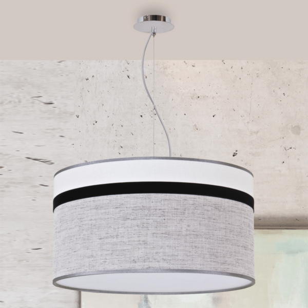 COLGANTE PANTALLA EN DISTINTOS TEJIDOS, CON CORTE EN TERCIPOELO NEGRO, CREANDO ASI DISTINTAS OPCIONES DE ACABADOS.